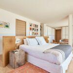 The interiors are a charming blend of Ibizan chic and mid-century style, bathed in natural light from the sliding doors onto the terrace which make the most of the incredible sea views. The split-level living space is divided into two zones, each with cosy sofa seating and quirky art pieces. The same open-plan living space is also home to a dining table, seating six.
