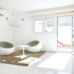 On the top floor around the atrium, a chair perches on the glass floor. A peaceful spot from which to enjoy the beautiful sea views, this area opens onto an upper terrace with sun loungers.
